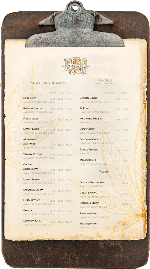 At Ingram & Sons Cannabis Co., we know a thing or two about cannabis. We have curated a selection of premium cannabis flower, prerolls, concentrates, vapes, edibles, and more. With a Cannabis Sommelier on hand, we’d love to help you navigate the big wide world of weed.